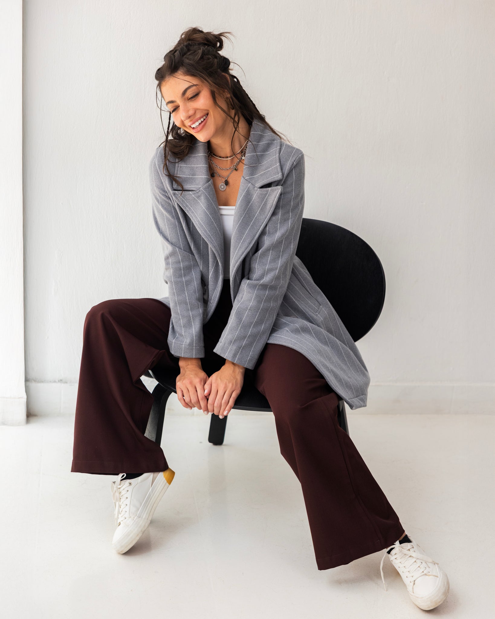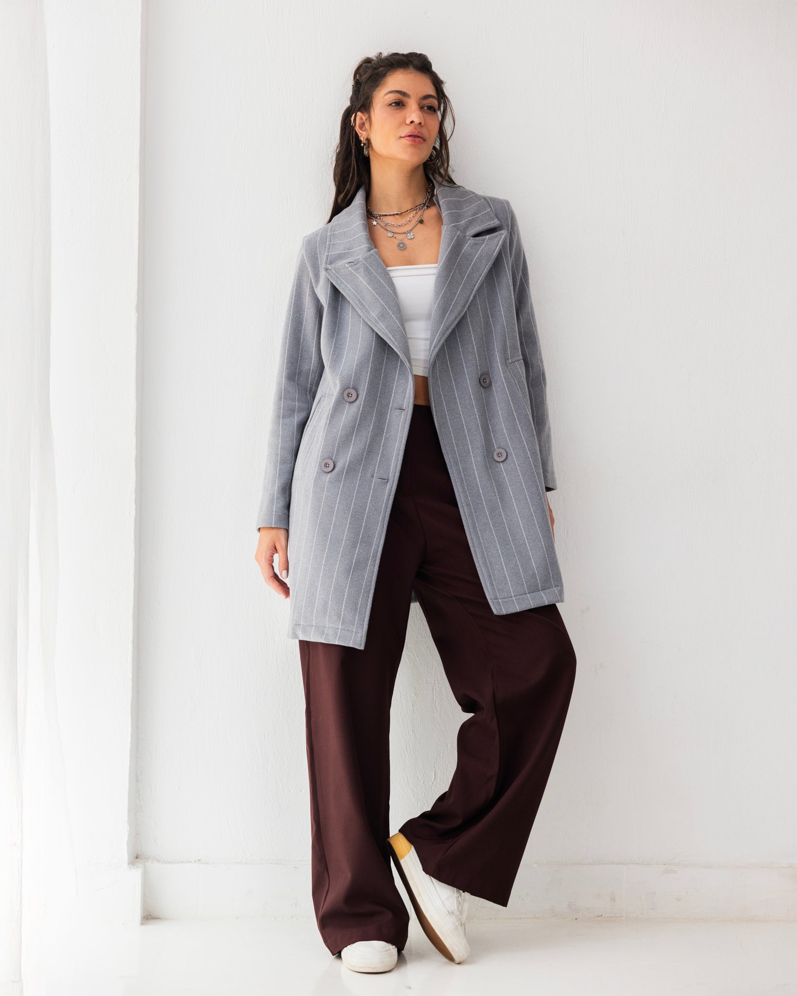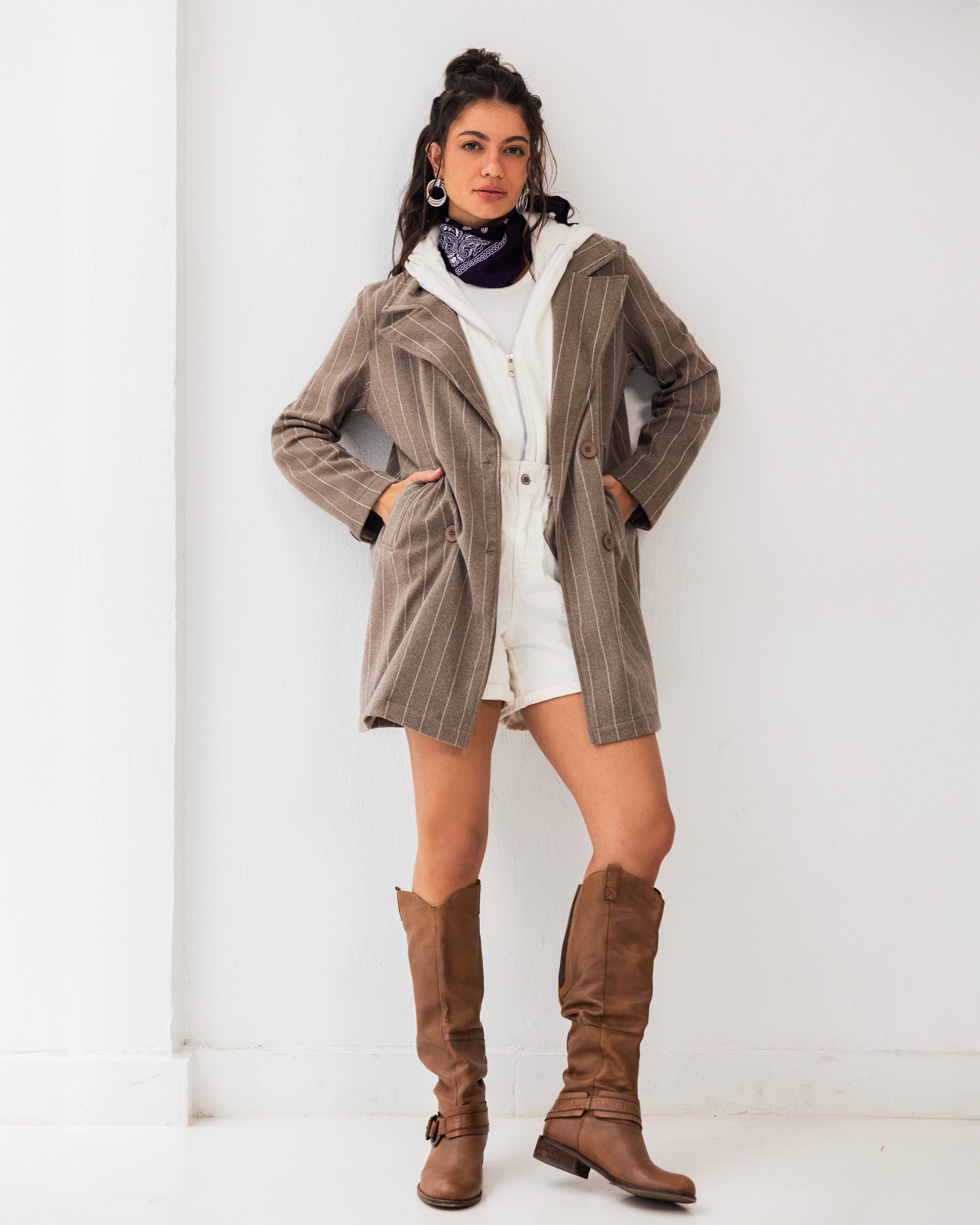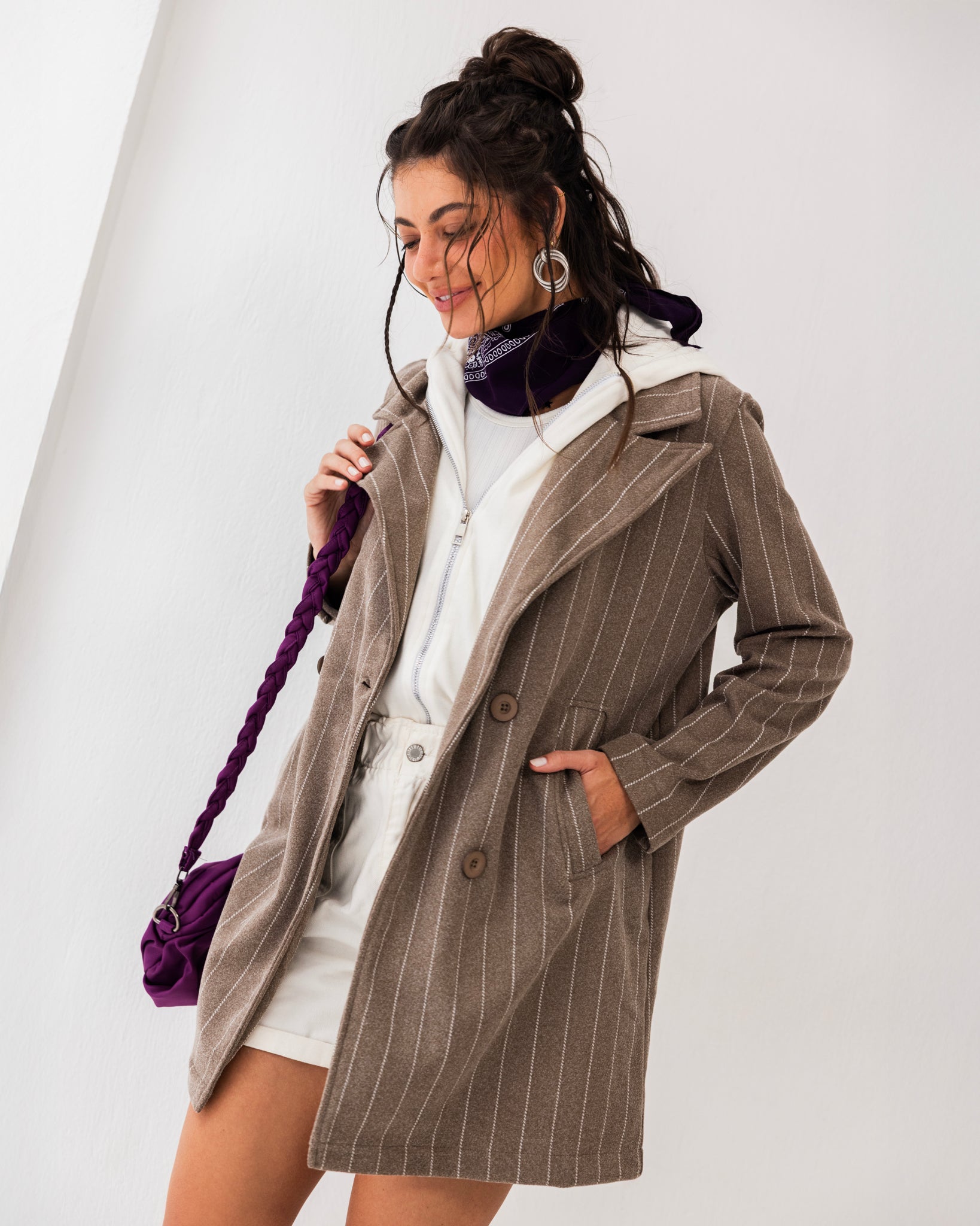 Striped coat with a detachable hood, offering warmth, comfort, and versatile everyday style.
