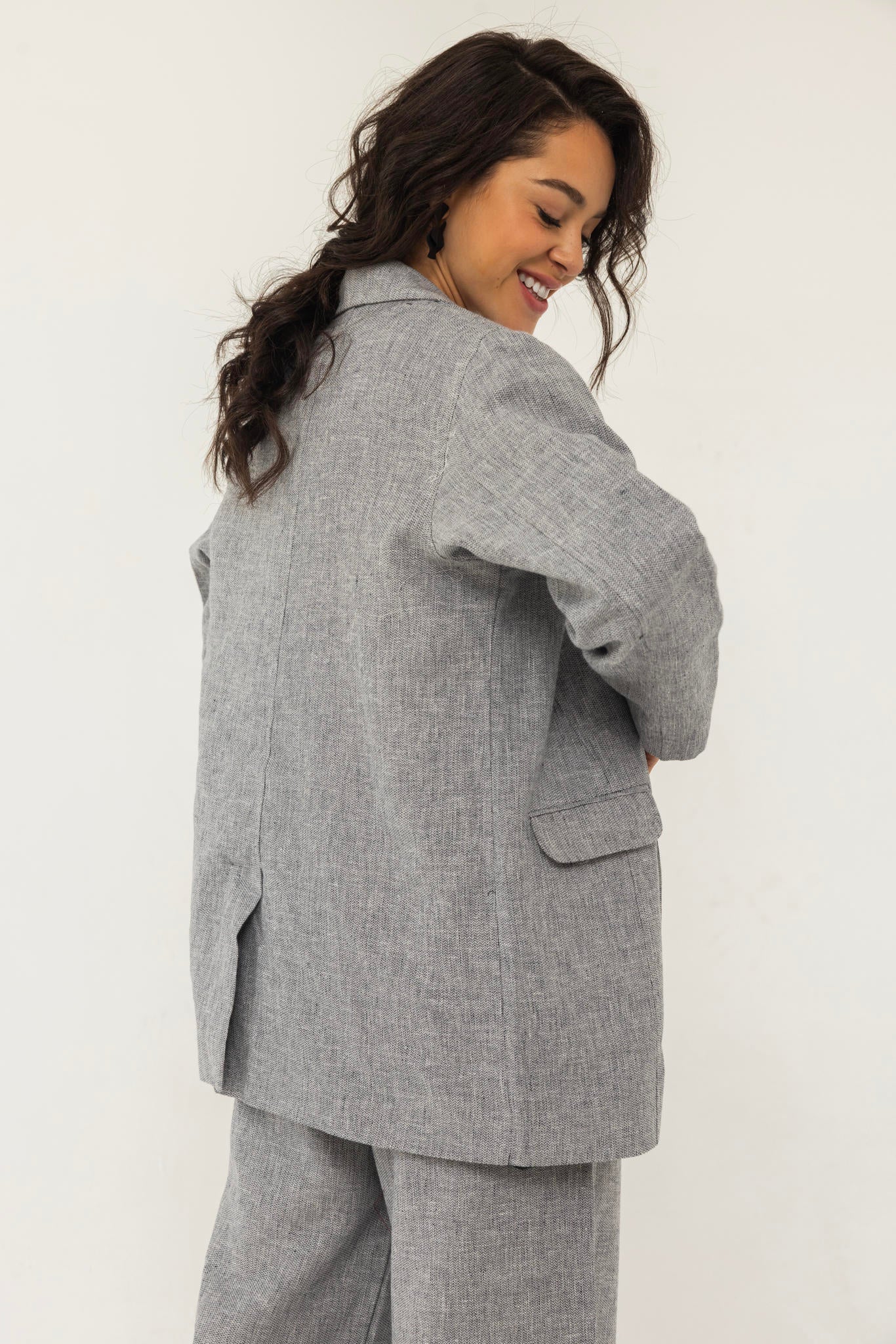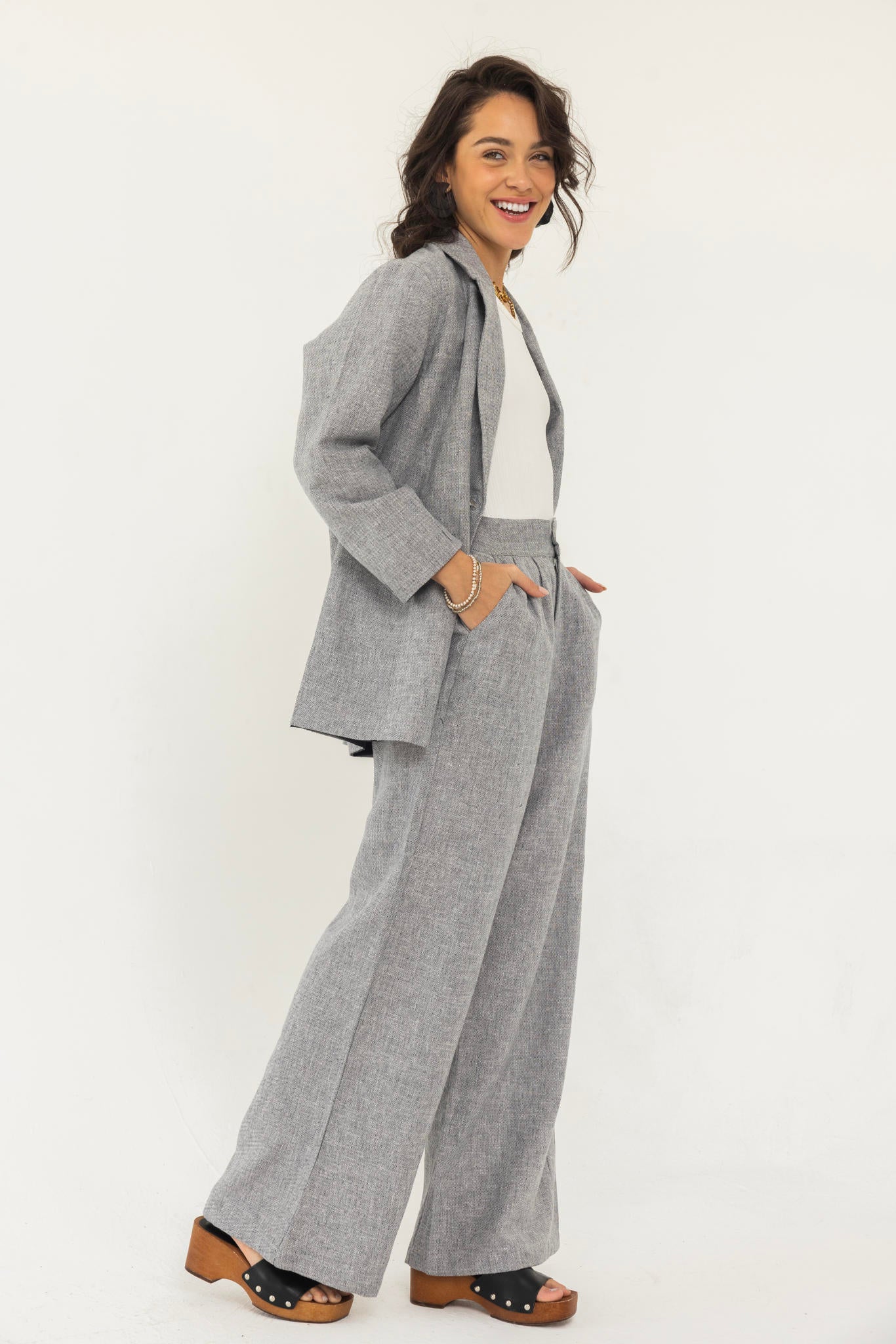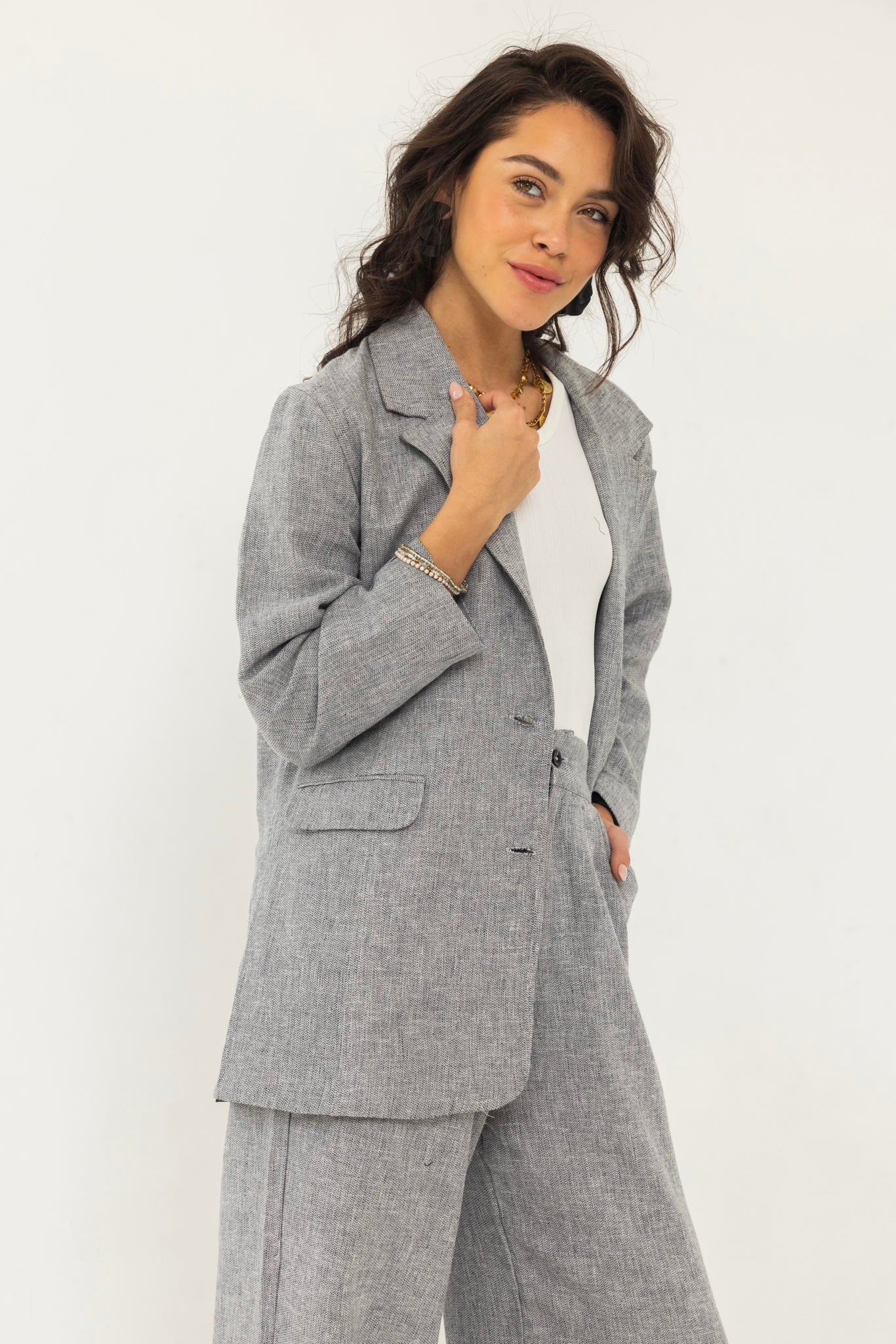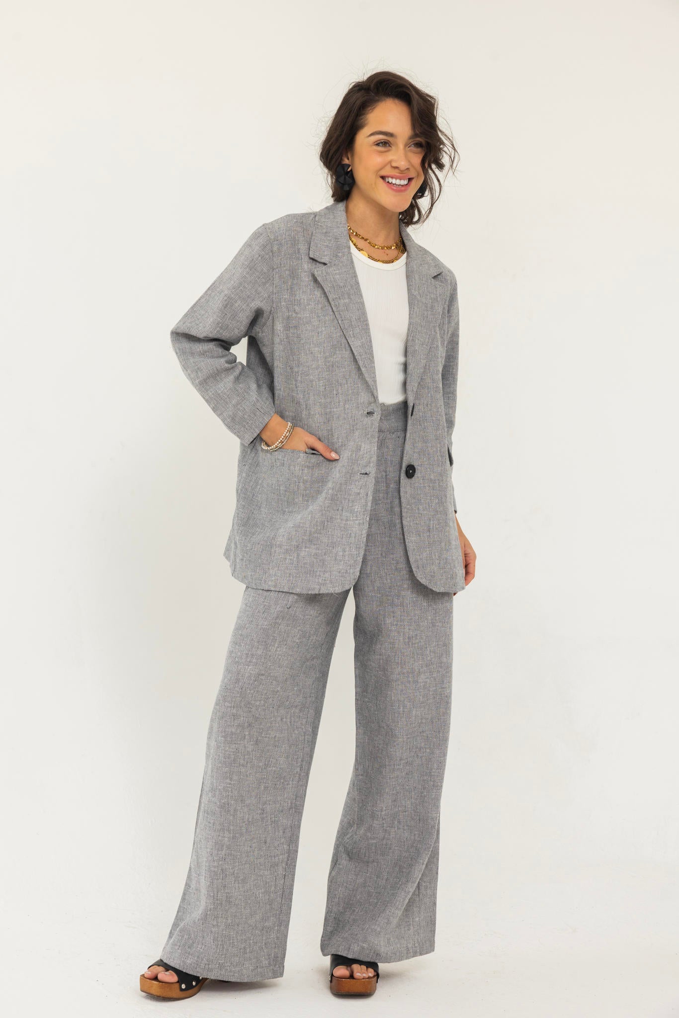A tailored blazer and pants set with a perfectly structured fit that flatters the body. Easy to style for both casual and formal looks.